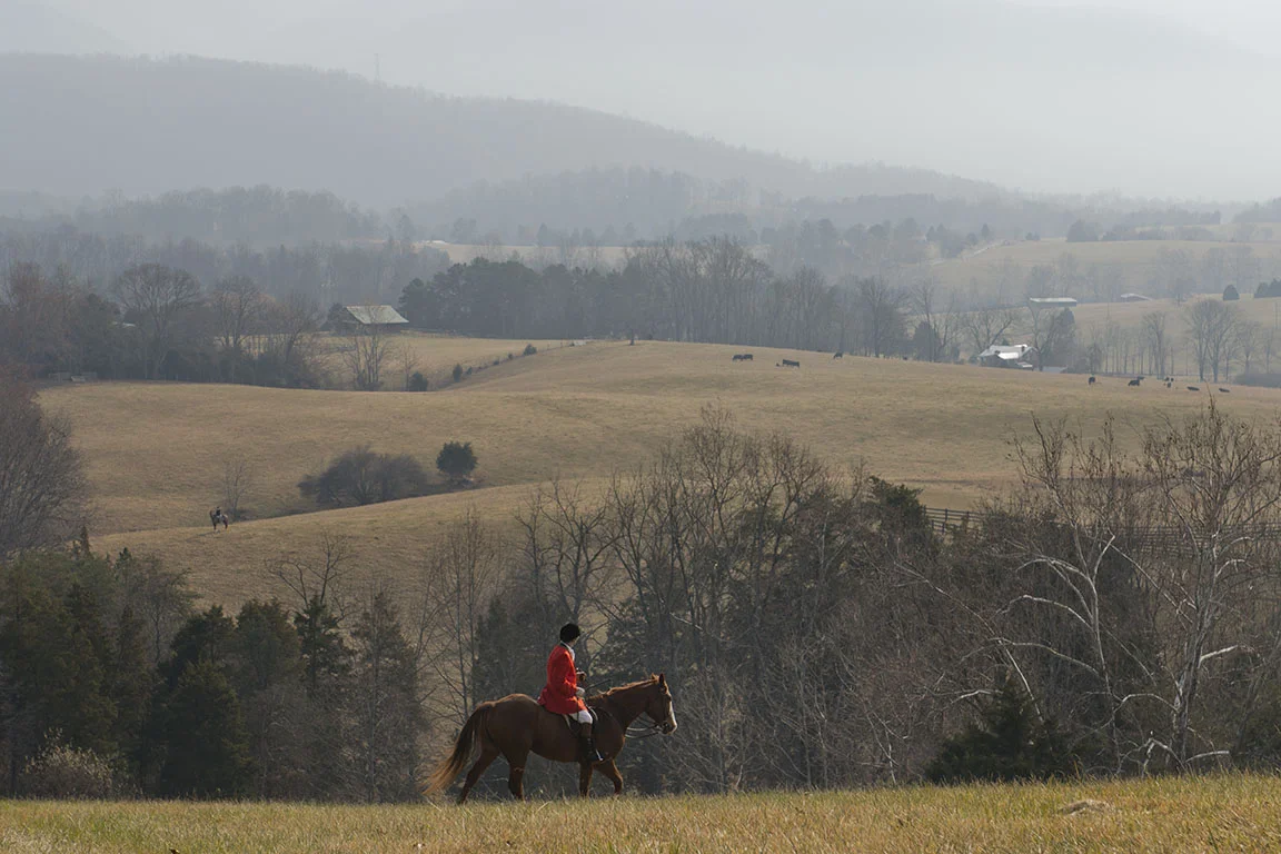 Steeped in tradition and history, the European sport of foxhunting finds its North American center in the state of Virginia. Mounted riders in scarlet and navy coats are led by a pack of hounds through wooded trails, over jumps, and across pastoral countryside in pursuit of their quarry. For these hunters, the appeal is in the thrill of the chase; the hounds are called off before there is bloodshed. My intentional exclusion of the fox from these photographs emphasizes the significance of ride and ritual over the actual quarry. Though unquestionably a real sport for experienced riders, the images in this body of work present a romanticized view of foxhunting culture. By photographing these hunts, I am portraying a time when formality was common, ritual was respected, and elegant sporting and socialization were one and the same.